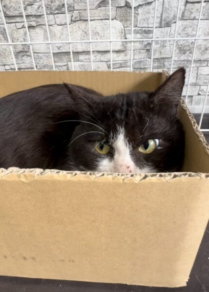 当団体でも、警戒心の強い成猫をこれまで保護してきました。成猫の場合、人との距離をはっきり取る子は珍しくありません多頭飼育崩壊の現場から保護した「うにくん」もその一頭です。保護当初は段ボールの奥に隠れ、人が近くにいるとごはんを食べませんでした。目つきも鋭く、常に周囲を警戒している様子でした。